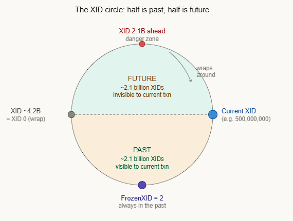 PostgreSQL doesn’t think of XIDs linearly — it treats them as a circle, where exactly half (~2.1 billion) are considered “the past,” and half are “the future” from any given XID. The key insight: PostgreSQL uses modular arithmetic — it doesn’t compare XIDs with > or <, but checks “is B within 2.1 billion steps ahead of A on the circle?” If yes, B is in the future. If no, B is in the past.