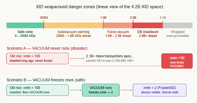 Every row written in PostgreSQL is stamped with the Transaction ID (XID) of the transaction that created it. PostgreSQL uses this stamp to decide visibility — “was this row written before or after my transaction?” The problem: XIDs are 32-bit integers, so they max out at ~4.2 billion and then wrap back to zero — like an odometer rolling over. When this happens, old rows can suddenly appear in the future, making them invisible to all queries. PostgreSQL will actually shut down the database before allowing this to happen.