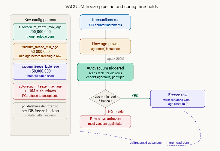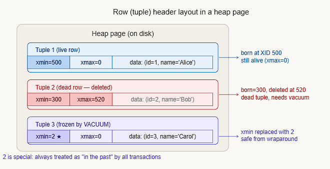 Why FrozenTransactionId = 2 is special XID 2 is a hardcoded constant. The visibility check has a special case: any row with xmin = 2 is unconditionally treated as visible to all transactions, bypassing the circular math entirely. This is what VACUUM does when it “freezes” a row. The three PostgreSQL warning levels you’ll see in logs as XIDs age: