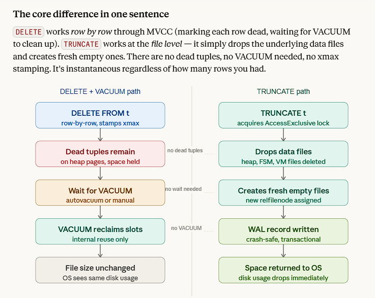 Unlike in MySQL, PostgreSQL’s TRUNCATE participates in transactions and can be rolled back.